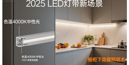 LED燈帶的出現(xiàn),為解決這一問題提供了完美的方案。2025年,LED燈帶技術進一步成熟,其低能耗、高亮度、長壽命和可靈活定制的特點,使其成為櫥柜下照明的首選。同時,消費者對于廚房美學和功能性的雙重需求,也促使LED燈帶在櫥柜下隱藏照明這一領域得到了廣泛的應用。