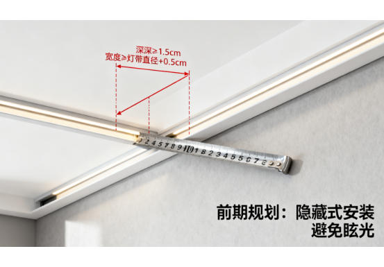 對于暗藏式安裝,提前預(yù)留燈槽深度至關(guān)重要。木工階段需讓師傅預(yù)留≥3cm的燈槽寬度,深度建議比燈帶厚度多5mm,這樣既能避免燈光溢出形成光斑,又能預(yù)留散熱空間。若采用明裝方案,可選擇帶鋁槽的防水燈帶,不僅能起到物理防護作用,鋁合金材質(zhì)還能增強散熱,延長燈帶使用壽命30%以上。