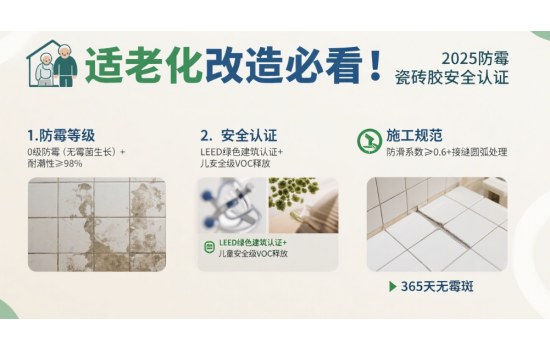 適老化改造是一項關(guān)乎老年人生活質(zhì)量和安全的重要工程,而防霉瓷磚膠品牌的選擇則是其中的關(guān)鍵環(huán)節(jié)。通過本文推薦的2025防霉瓷磚膠安全認證TOP3,以及選擇防霉瓷磚膠的相關(guān)建議,希望能夠幫助大家在適老化改造中做出正確的選擇,為老年人打造一個健康、舒適、安全的居住環(huán)境。讓我們共同關(guān)注老年人的需求,用優(yōu)質(zhì)的產(chǎn)品和服務為他們的晚年生活增添溫暖和保障。