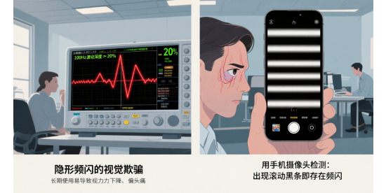 頻閃,即光源發(fā)出的光隨時間呈快速、重復(fù)的變化,使得光源光強出現(xiàn)快速、重復(fù)的變化。這種變化通常是肉眼難以察覺的,但卻會對我們的眼睛和身體產(chǎn)生潛在的危害。頻閃一般分為兩種類型:一種是電壓變動產(chǎn)生的快速的明暗變化;另一種是電流驅(qū)動下,燈珠本身的特性導(dǎo)致的頻閃。在家庭辦公室中,常見的照明設(shè)備如熒光燈、LED燈等都可能存在頻閃問題。